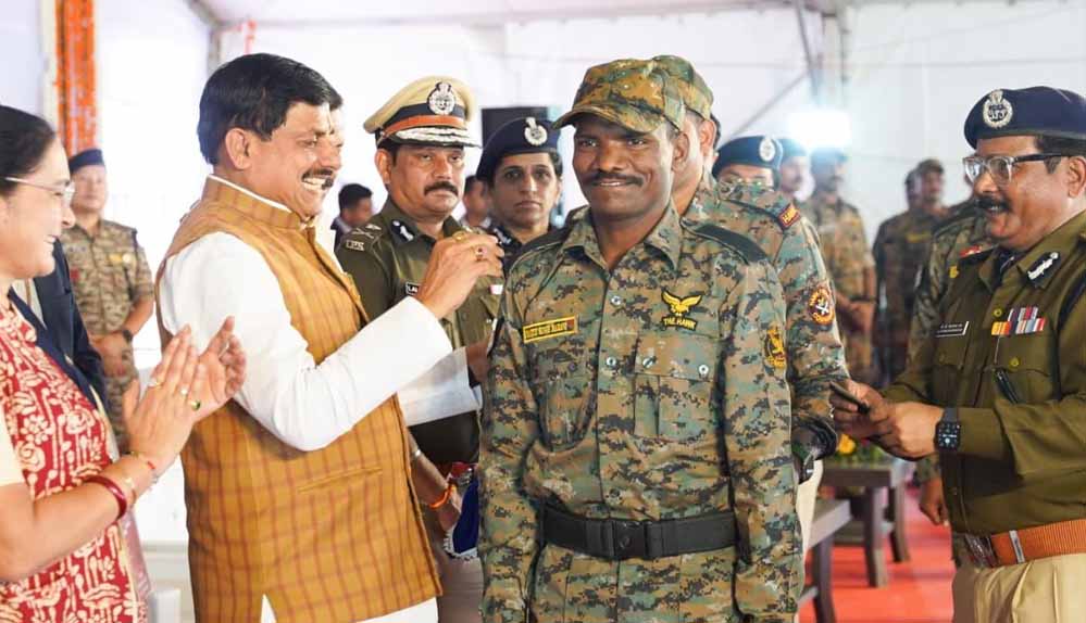 मध्य प्रदेश के मुख्यमंत्री मोहन यादव ने सोमवार को बालाघाट में आयोजित एक कार्यक्रम में नक्सली मुठभेड़ों में अदम्य साहस और वीरता का प्रदर्शन करने वाले 60 जवानों को नियमों से हटकर पदोन्नति प्रदान की। एक आधिकारिक विज्ञप्ति के अनुसार, मुख्यमंत्री ने राज्य की शांति और सुरक्षा के लिए प्राणों की आहुति देने वाले जवानों को अमर जवान ज्योति पर पुष्पांजलि अर्पित कर श्रद्धांजलि दी।