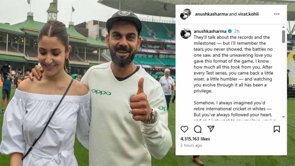 ने अपने पति और मशहूर क्रिकेटर विराट कोहली के टेस्ट क्रिकेट से संन्यास लेने पर इंस्टाग्राम के जरिए भावुक प्रतिक्रिया दी। अपनी पोस्ट में अनुष्का ने बताया कि भले ही उन्हें अंदेशा था कि विराट एक दिन टेस्ट क्रिकेट को अलविदा कहेंगे, लेकिन जब यह पल आया, तो उन्होंने इसे पूरे प्यार और गरिमा के साथ स्वीकार किया। सोमवार को विराट के संन्यास की खबर ने उनके प्रशंसकों को चौंका दिया और करोड़ों दिलों को दुखी कर दिया। इस पर आई अनुष्का शर्मा की पहली प्रतिक्रिया भी झट से वायरल हो गई है। इस पर दोनों के चाहने वाले लगातार अपना रिएक्शन साझा कर रहे हैं।