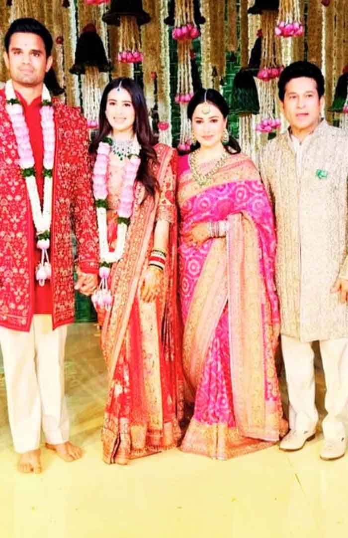 भारतीय टीम के पूर्व क्रिकेटर आकाश चोपड़ा ने शादी समारोह के दौरान की एक तस्वीर सोशल मीडिया पर शेयर की है, जिसमें सचिन तेंदुलकर अपनी पत्नी अंजलि और बेटे अर्जुन तेंदुलकर, उनकी पत्नी सानिया चंडोक और पूर्व क्रिकेटर सुरेश रैना अपनी पत्नी के साथ नजर आ रहे हैं।
