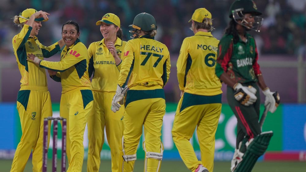 आईसीसी वुमेंस वनडे वर्ल्ड कप 2025 में गुरुवार को ऑस्ट्रेलिया और बांग्लादेश के बीच मुकाबला खेला गया. इस मैच में डिफेंडिंग चैम्पियन ऑस्ट्रेलिया ने बांग्लादेश को 10 विकेट से रौंद दिया. इस जीत के साथ ही ऑस्ट्रेलिया ने वर्ल्ड कप के सेमीफाइनल में अपनी जगह पक्की कर ली है. ऐसा करने वाली वह पहली टीम है. ऑस्ट्रेलिया अबतक इस टूर्नामेंट में अपराजेय रहा है. 5 मैच में से उसे 4 में जीत मिली है, जबकि एक मैच बारिश के चलते धुल गया था.