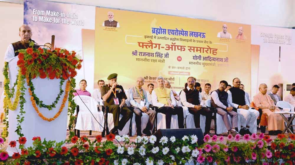 राजधानी लखनऊ में शनिवार को आत्मनिर्भर भारत का एक नया अध्याय लिखा गया, जब ब्रह्मोस एयरोस्पेस लिमिटेड की लखनऊ इकाई में उत्पादित सुपरसोनिक ब्रह्मोस मिसाइलों के पहले बैच का फ्लैग ऑफ केंद्रीय रक्षा मंत्री राजनाथ सिंह और मुख्यमंत्री योगी आदित्यनाथ ने किया। भारत माता की जय’ के जयघोष के बीच जब मिसाइलों का पहला जत्था रवाना हुआ तो समारोह गर्व, गौरव और देशभक्ति से गूंज उठा। कार्यक्रम को संबोधित करते हुए मुख्यमंत्री योगी आदित्यना ने कहा कि ब्रह्मोस केवल भारत की नहीं, बल्कि पूरी दुनिया में अपने मित्र देशों की रक्षा करने का सबसे सक्षम हथियार है। उन्होंने कहा कि रक्षा मंत्री राजनाथ सिंह के प्रयास से ब्रह्मोस लखनऊ में विकसित हुआ है, जो देश की खुशहाली का माध्यम बना है। जब व्यक्ति सुरक्षित रहता है, तभी चैन की नींद सोता है। लखनऊ में बनी मिसाइल पूरे देशवासियों की सुरक्षा और समृद्धि की गारंटी है।