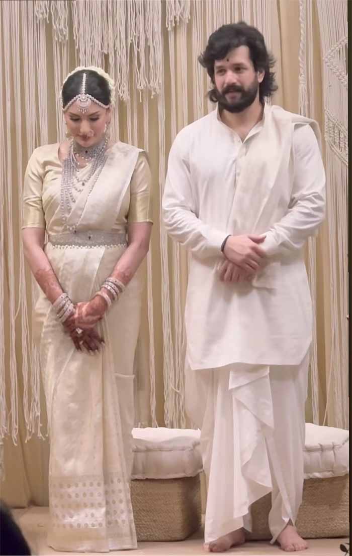 साउथ सुपरस्टार नागार्जुन के घर फिर जश्न का माहौल है। नागार्जुन के छोटे बेटे और नागा चैतन्य के भाई अखिल अक्किनेनी शादी के बंधन में बंध गए हैं। उन्होंने 6 जून को हैदराबाद में अपनी गर्लफ्रेंड जैनब रावजी से शादी कर ली है, जिसकी तस्वीरें सोशल मीडिया पर तेजी से वायरल हो रही हैं। हालांकि, अखिल अक्किनेनी ने अभी तक आधिकारिक तौर पर शादी की पहली तस्वीरें शेयर नहीं की हैं, लेकिन उनकी शादी फंक्शन की कई इंटरनेट पर वायरल हो गईं। वायरल हो रही फोटोज में अखिल को ट्रेडिशनल व्हाइट आउटफिट में देखा जा सकता है, जबकि जैनब आइवरी की कढ़ाई वाली एक ऑफ-व्हाइट साड़ी में बेहद खूबसूरत लग रही हैं। इसके साथ ही उन्होंने सुंदर डिजाइन वाले हीरे के आभूषणों भी पहने हैं और बालों को व्हाइट फूलों से सजाया है। ओवरऑल लुक में दुल्हन बनी जैनब बेहद प्यारी लग रही हैं। इसके अलावा एक अन्य फोटो में नागार्जुन अपने बेटे के साथ शादी की रस्म निभाते नजर आ रहे हैं। अखिल की शादी में नागार्जुन के बड़े बेटे नागा चैतन्य और उनकी पत्नी शोभिता धुलिपाला भी मौजूद रहे।
