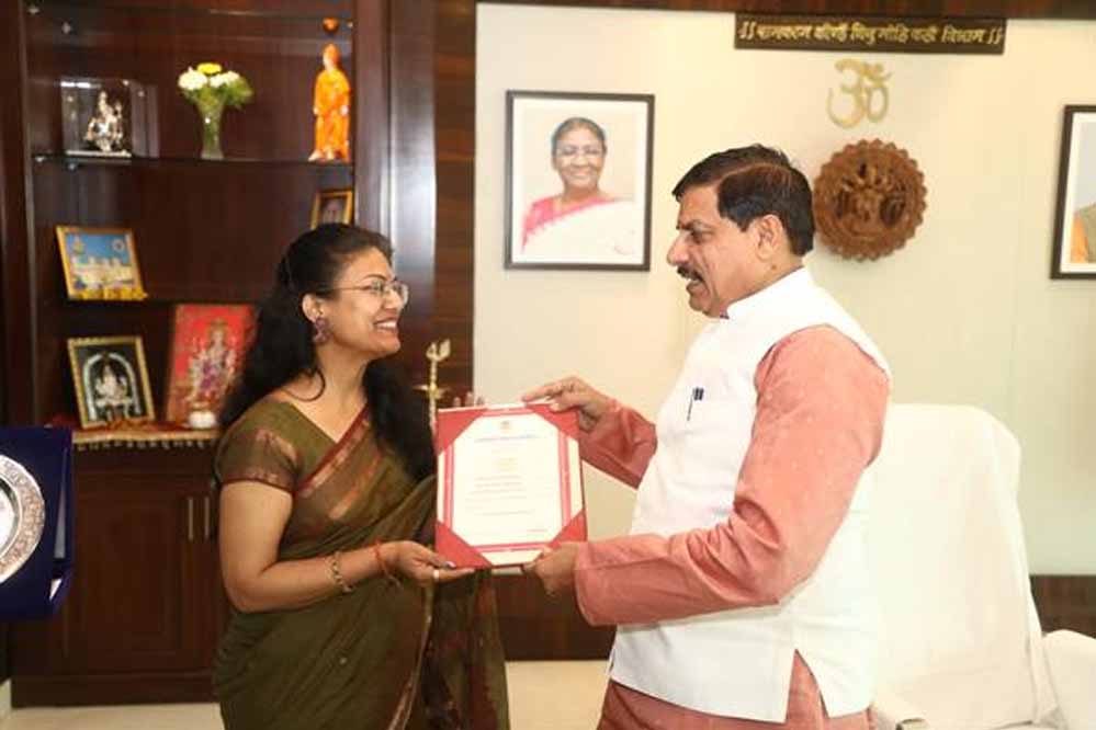 मुख्यमंत्री डॉ. यादव ने सुश्री शीला दाहिमा को मुख्यमंत्री उत्कृष्टता पुरस्कार 2022-23 से सम्मानित किया