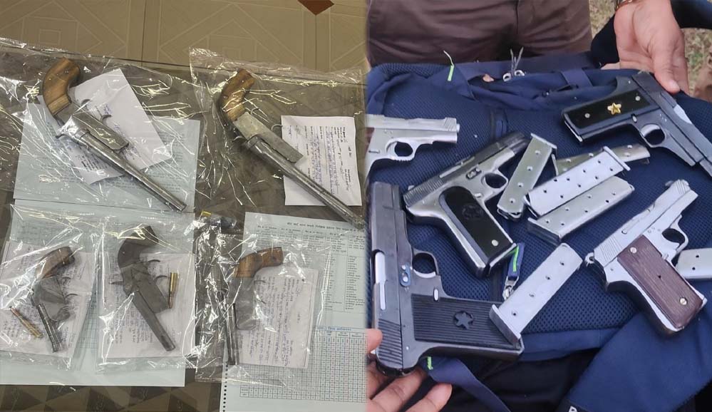 11 अवैध हथियार, कारतूस, मैग्जीन और बुलेट मोटर साइकिल जब्त