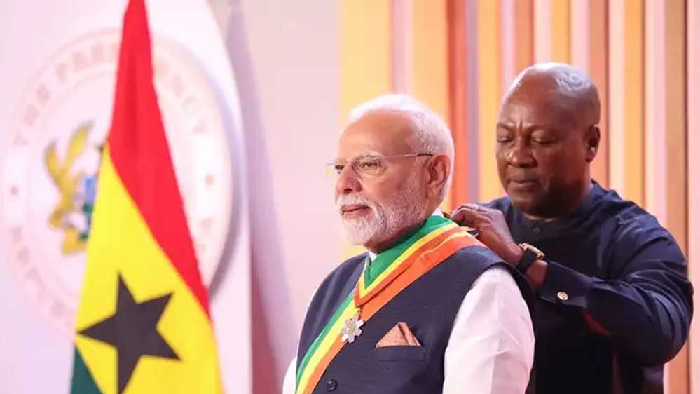 प्रधानमंत्री नरेंद्र मोदी को बुधवार को पश्चिम अफ्रीकी देश घाना के सर्वोच्च राष्ट्रीय सम्मान 'द ऑफिसर ऑफ द ऑर्डर ऑफ द स्टार ऑफ घाना' से सम्मानित किया गया। भारतीय प्रधानमंत्री को यह सम्मान उन्हें उनकी 'प्रतिष्ठित राजनीति और प्रभावशाली वैश्विक नेतृत्व' के लिए दिया गया। घाना के राष्ट्रपति जॉन ड्रामानी महामा ने पीएम मोदी को पुरस्कार प्रदान किया। प्रधानमंत्री मोदी पांच देशों की यात्रा के पहले चरण में घाना पहुंचे हैं। इस दौरान दोनों देशों के नेताओं के बीच बैठक हुई, जिसमें अहम समझौतों पर हस्ताक्षर किए गए।