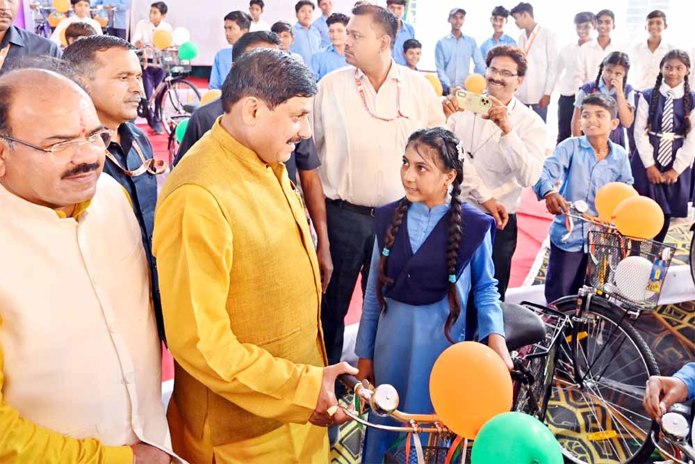 मुख्यमंत्री डॉ. यादव ने समग्र शिक्षा अभियान के अंतर्गत स्कूली बच्चों को नि:शुल्क साइकिल वितरण के 2 दिवसीय अभियान का शुभारंभ करते हुए 50 विद्यार्थियों को नि:शुल्क साइकिलें वितरित कीं। मुख्यमंत्री डॉ. यादव का विद्यार्थियों ने एक धुन में साइकिल की घंटी बजाकर अपनी प्रसन्नता व्यक्त की और मुख्यमंत्री डॉ. यादव का अभिवादन किया। अभियान के पहले दिन विभिन्न जिलों में विद्यार्थियों को 4 लाख 30 हजार साइकिलें बांटी गईं। मुख्यमंत्री डॉ. मोहन यादव ने गुरु पूर्णिमा के राज्य स्तरीय कार्यक्रम में गुरुजनों को सम्मानित भी किया। मुख्यमंत्री डॉ. यादव ने गुरु पूर्णिमा के अवसर पर उल्लेखनीय उपलब्धियों के लिए शिक्षक श्री मनोज सोहनी, श्री देवेंद्र बंसल, डॉ. एस.के. पाल, श्री मनोज कौशल, श्री सुरीत दास बनोथे, श्रीमती शुभांगी नामड़े, श्रीमती सारिका शर्मा, श्रीमती वंदना रामचंदानी, श्री योगेश विश्नोई और श्रीमती बख्तौर खान को अंगवस्त्र एवं श्रीफल भेंटकर सम्मानित किया। इस अवसर पर सांदीपनि विद्यालय पर केंद्रित लघु फिल्म का प्रदर्शन भी किया।