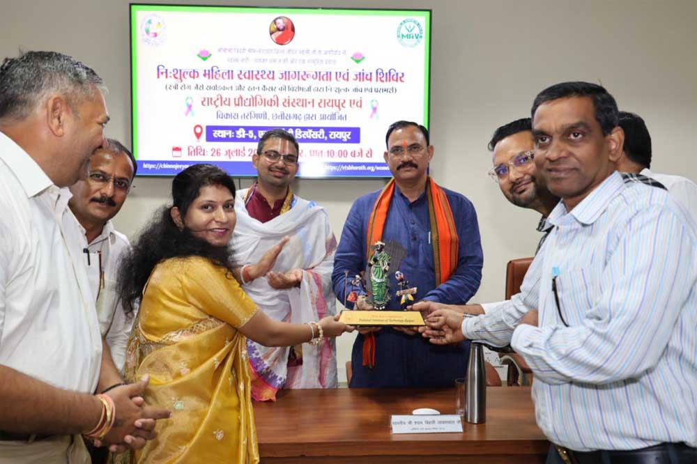 राष्ट्रीय प्रौद्योगिकी संस्थान (एनआईटी) रायपुर एवं विकास तरंगिणी, छत्तीसगढ़ के संयुक्त तत्वावधान में आज महिलाओं के लिए नि:शुल्क स्वास्थ्य जागरूकता एवं जाँच शिविर का एनआईटी परिसर में आयोजन किया गया। यह जांच शिविर और जागरूकता कार्यक्रम विशेषतः सर्वाइकल और ब्रेस्ट कैंसर जैसी गंभीर बीमारियों के लिए आयोजित किया गया। शिविर के माध्यम से महिलाओं को नि:शुल्क जाँच, परामर्श और आवश्यक दवाइयाँ उपलब्ध कराई गईं। इस अवसर पर राज्य के स्वास्थ्य मंत्री श्री श्याम बिहारी जायसवाल शिविर में शामिल हुए और महिलाओं को बेहतर स्वास्थ्य सुविधाएं देने की सरकार की प्रतिबद्धता को दोहराया।
