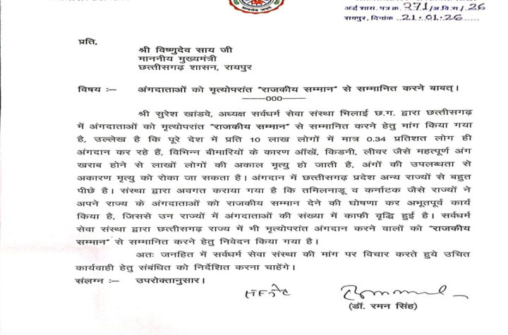 अंगदान को मिले राजकीय सम्मान” विधानसभा अध्यक्ष डॉ. रमन सिंह ने मुख्यमंत्री को लिखा पत्र मृत्योपरांत अंगदान को बढ़ावा देने...