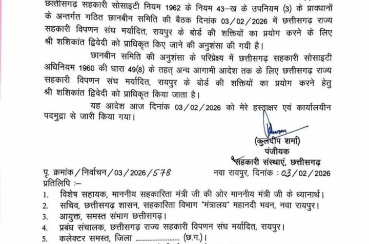 1 min read राज्य सहकारी बोर्ड में मनोनयन, शक्तियों का प्रयोग करने शशिकांत द्विवेदी प्राधिकृत February 4, 2026 Pradesh 24 रायपुर. राज्य सहकारी विपणन संघ मर्यादित बोर्ड की शक्तियों का प्रयोग करने शशिकांत द्विवेदी को प्राधिकृत किया गया है, जारी...