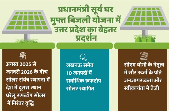 1 min read प्रधानमंत्री सूर्य घर मुफ्त बिजली योजना में उत्तर प्रदेश का बेहतर प्रदर्शन February 22, 2026 Pradesh 24 अगस्त 2025 से जनवरी 2026 के बीच सोलर संयंत्र स्थापना में देश में दूसरा स्थान, घरेलू रूफटॉप सोलर में निरंतर...