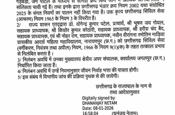 रायपुर. छत्तीसगढ़ शासन के उच्च शिक्षा विभाग ने वित्तीय अनियमितताओं के गंभीर मामले में बड़ी प्रशासनिक कार्यवाही करते हुए शासकीय...