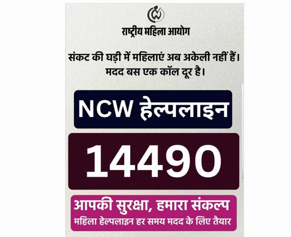 राष्ट्रीय महिला आयोग ने महिलाओं के हक में एक बड़ा कदम उठाया है। कमीश्न ने महिलाओं के लिए 24×7 शॉर्ट-कोड हेल्पलाइन 14490 जारी किया है। यह हेल्पलाइन चौबीसों घंटे काम करेगी। एनसीडब्ल्यू ने कहा कि यह हेल्पलाइन कॉल करने वालों को प्रथम संपर्क बिंदु के रूप में मार्गदर्शन प्रदान करेगी, प्राधिकारियों के साथ समन्वय स्थापित करेगी तथा आपात स्थितियों में समय पर हस्तक्षेप की सुविधा प्रदान करेगी।